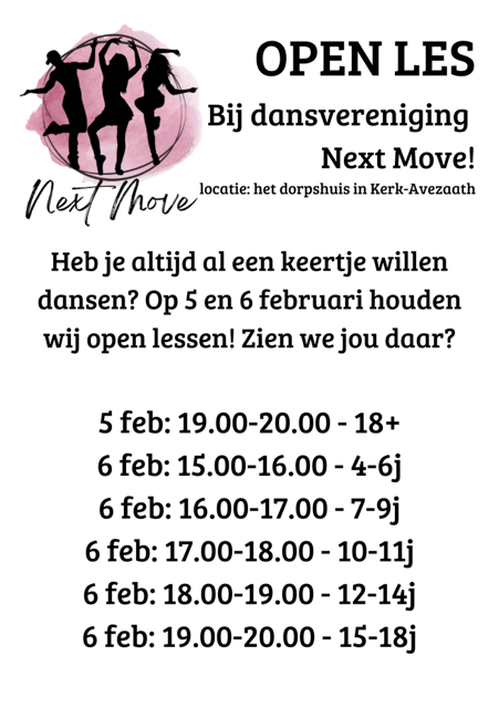 Dansvereniging Next Move is ontstaan uit een passie voor dans en de wens om deze te delen met anderen in Kerk-Avezaath en omgeving. De dansvereniging is in 2017 begonnen als dansvereniging ' Doe Je Dans' onder leiding van mijn nichten Cindy & Eline van Alphen. In 2025 heeft Britt het stokje van hen overgenomen. Een dansvereniging met hetzelfde hart; een vereniging die zich richt op dansplezier, verbondenheid binnen de dansgroep en zowel persoonlijke als fysieke ontwikkeling, maar een vereniging met de naam 'Next Move', en onder leiding van Britt Le Noble. Waarom de naam Next Move? "Next'' omdat ik het overneem van mijn twee nichten, en move.. dat hoef ik niet uit te leggen! Omdat we leuke moves gaan maken op verschillende dansen.